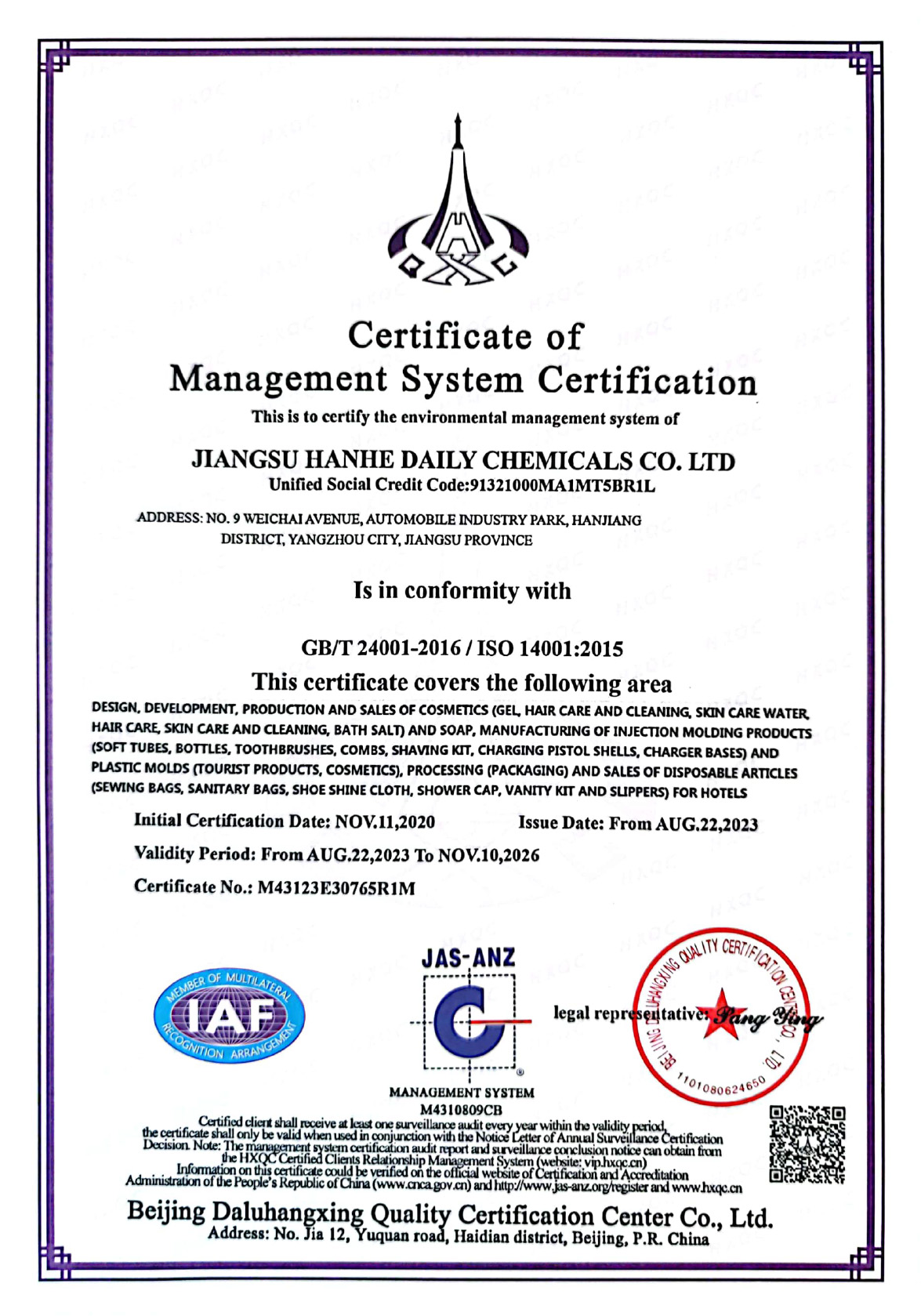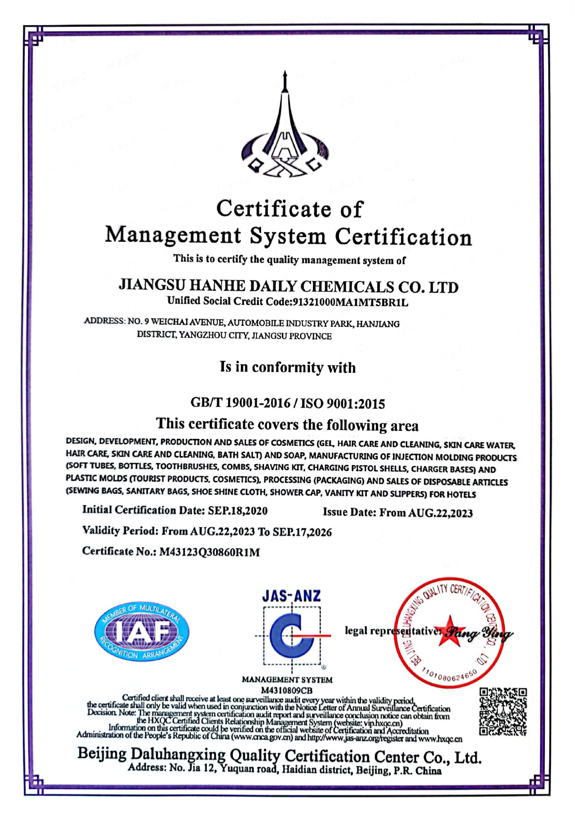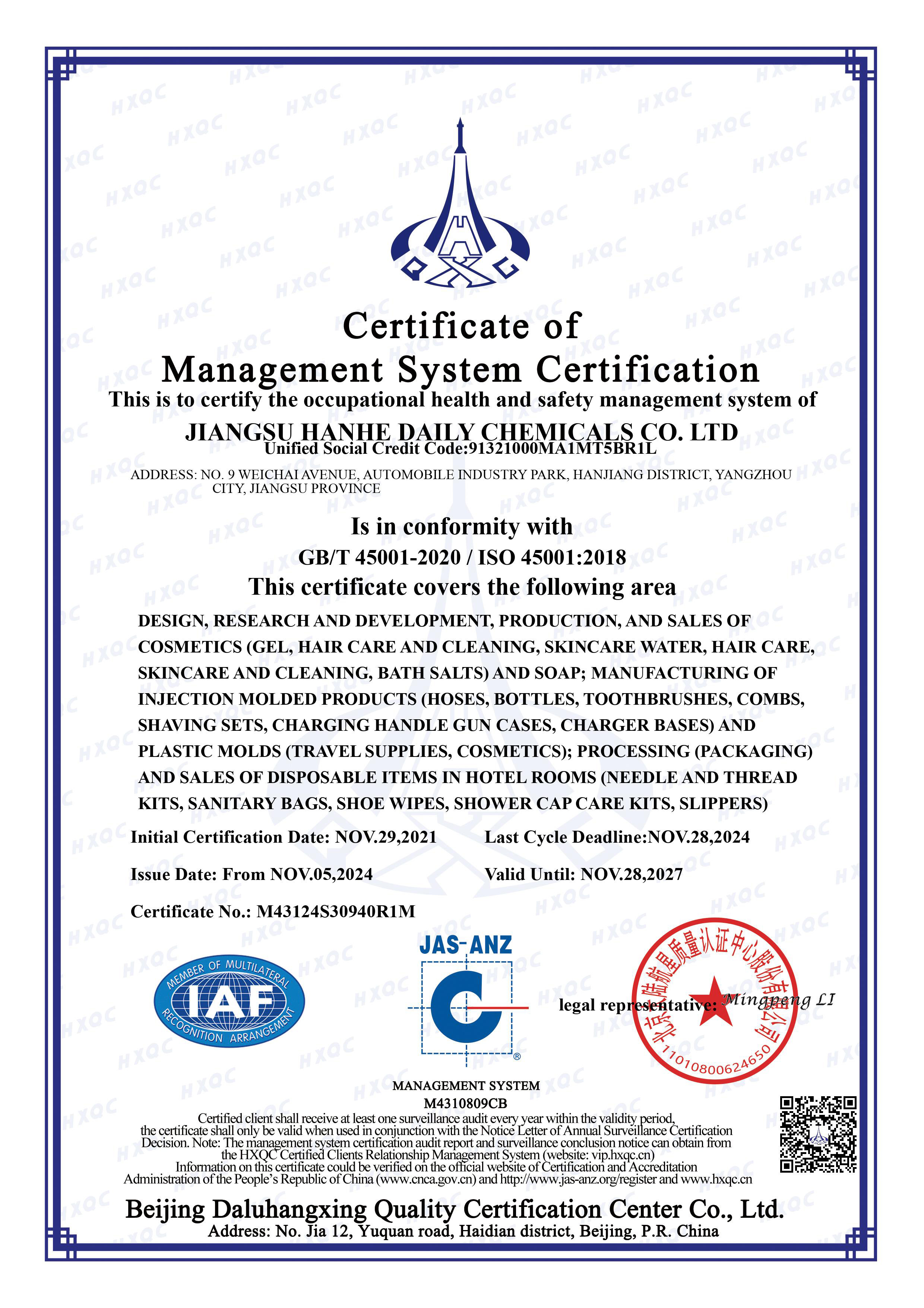 Jiangsu Hanhe Daily Chemicals Co., Ltd was established in 2016. It is a integrated OEM and OED supplier of hotel supplies, aviation supplies, tourism necessities and body care products. Trading partners are all over the world. Products are mainly exported to the United States, European Union, Japan, South Korea, middle east, South America and southeast Asia.